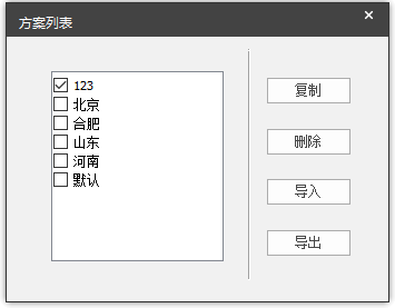 点击【设置】,可进入方案列表进行现有方案的管理。勾选相应方案后,可复制、删除、导出该方案。注意:默认储存的方案不能被删除。