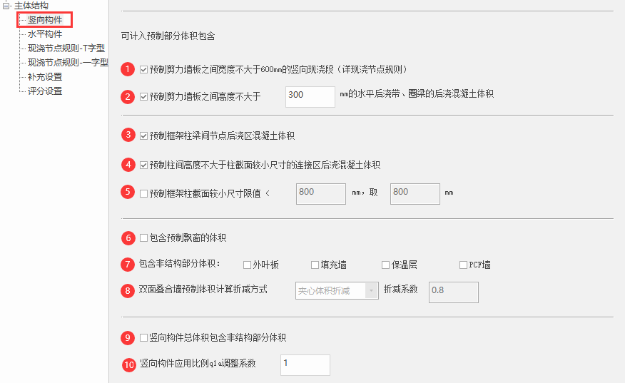 竖向构件选择界面如下图所示,第1-8条影响预制构件的计算规则,第9条影响竖向现浇构件混凝土总体积的计算规则,第10条影响竖向预制构件应用比例。