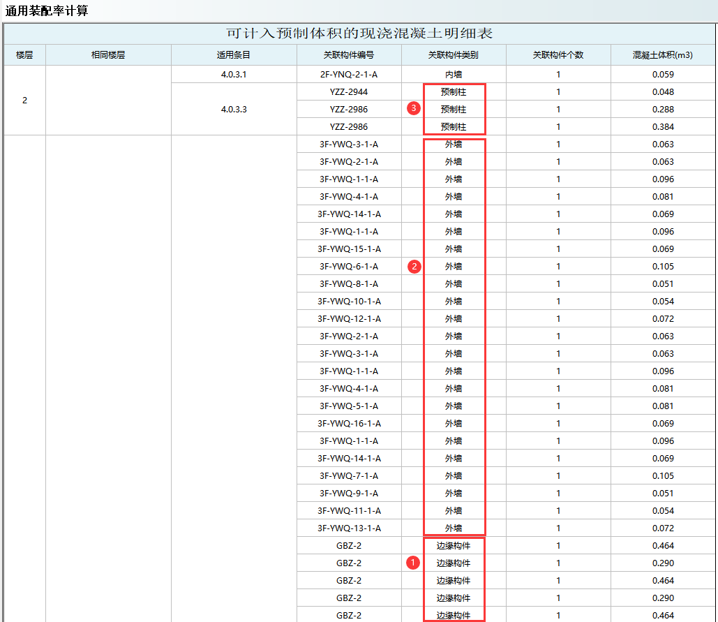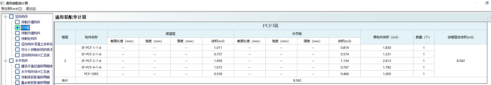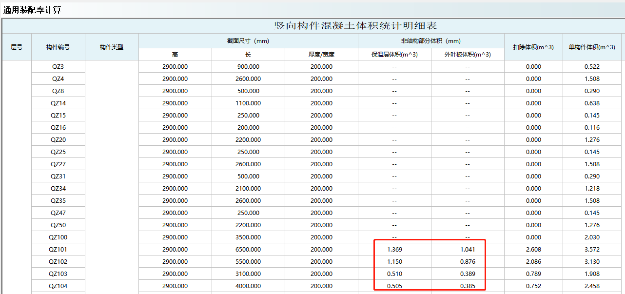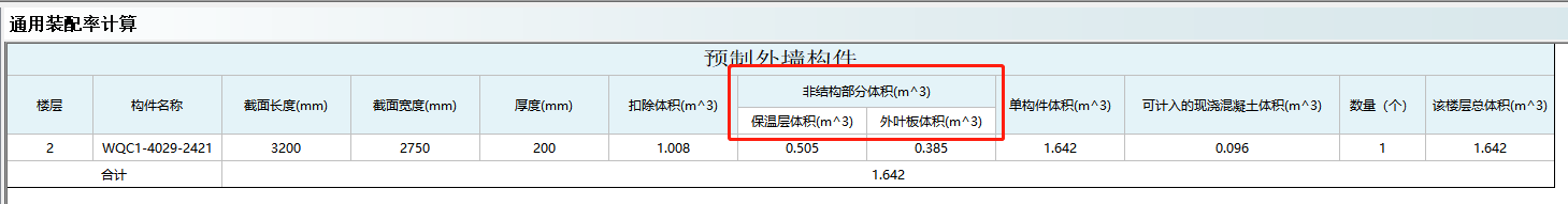 当第7条中勾选外页板、保温层、填充墙时,勾选此选项,则在竖向构件总体积中也考虑勾选项的体积。输出结果详下图所示: