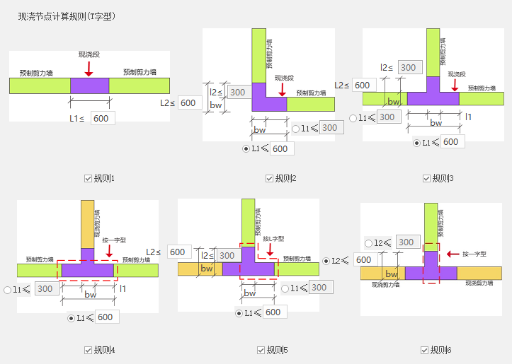 若勾选,则按现浇节点计算规则(T/一字型)进行计算竖向现浇段的混凝土体积,将其结果输出在“可计入预制构件的体积”表格中。
