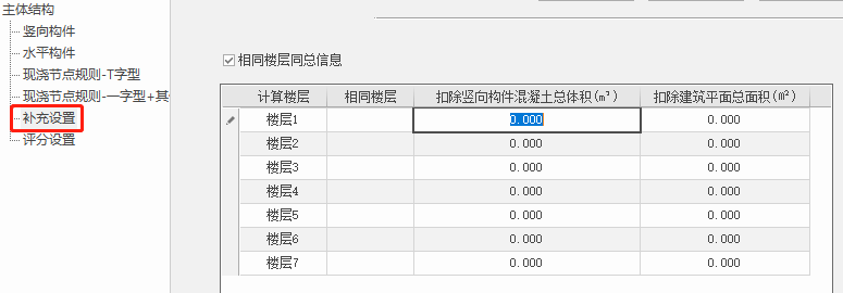 此处输入数值后将在竖向现浇构件总体积和水平投影总面积中扣除相应体积和面积,如下图所示: