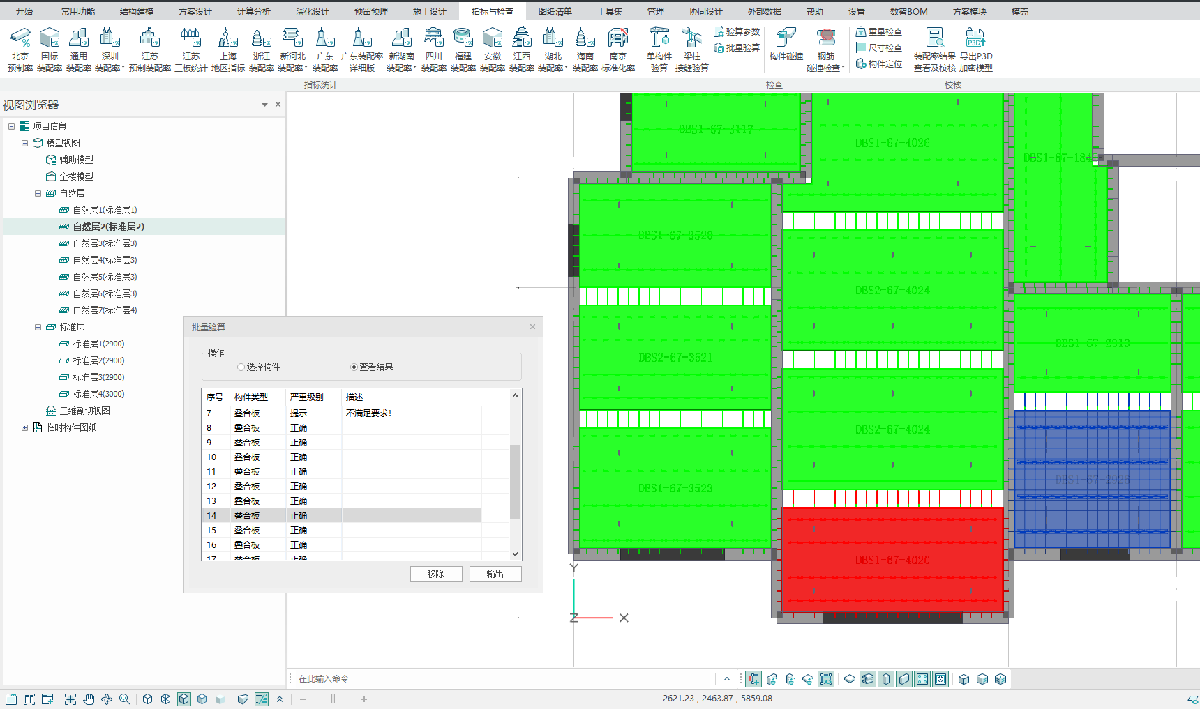 在对话框中选择“查看结果”,模型中已校核的构件会以不同颜色高亮显示(红色表示验算未通过、绿色表示验算通过),双击对话框中的构件项次,模型中的对应构件会以高亮显示,如图所示。