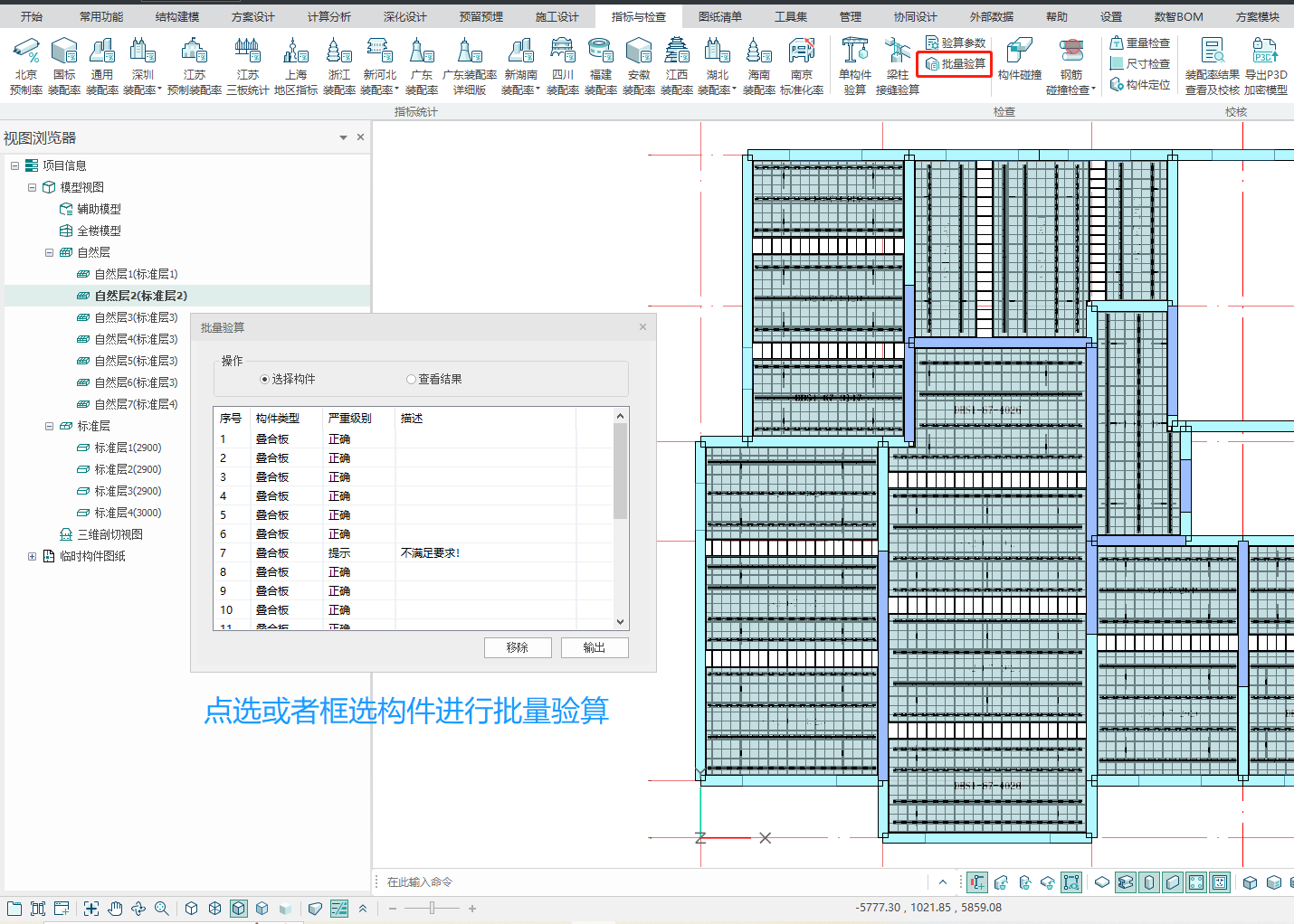 点击“检查—批量验算”,弹出“批量验算”对话框,鼠标逐个点选或框选模型中需要进行验算的构件,在对话框中会依次显示每个构件的验算结果,如图所示。