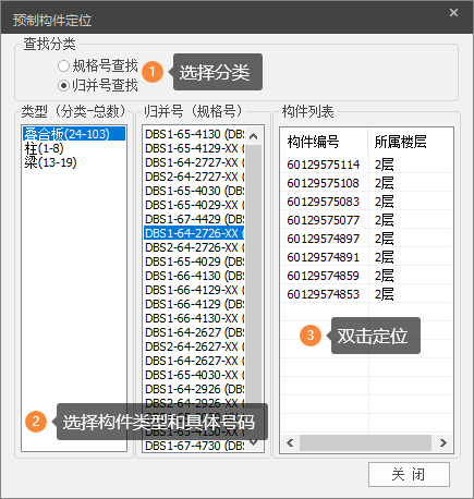 点击【构件定位】,弹出下图所示对话框,可在其中选择按规格号或归并号查找构件,之后选择具体的规格号/归并号,双击切换到构件位置,被定位构件将高亮显示。