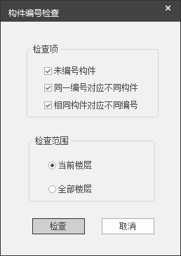 点击【编号检查】弹出【构件编号检查】对话框,可对未编号构件、同一编号对应不同构件以及相同构件对应不同编号三种检查项进行检查。检查范围可选择当前楼层,也可对全部楼层进行检查。选择好检查项和检查范围后,点击【检查】,即可对已有的预制构件编号进行检查。