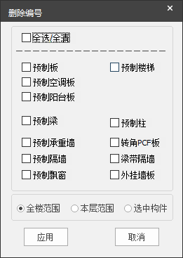 【全楼范围】:选择此项时,直接点击应用则将整个模型中的编号全部清除(仅清除所选构件类型的编号)。