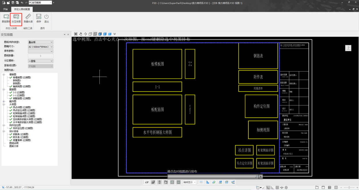 完成图签图框和排图区域设置之后,点击【交互排图】,进入交互排图功能中,如下图所示,选择拟设置排图方案的预制构件类型、图幅尺寸,设置分区模板和宫格线绘制要求,在视图列表中点击视图节点,在右图中进行视图的排布设置。