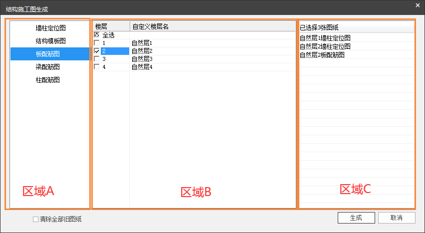 在已生成过结构平面图的情况下,勾选对话框左下部的选项“清除全部旧图纸”,重新生成图纸时会自动将全部旧图纸清除,否则仅对需要更新的旧图纸进行清除。