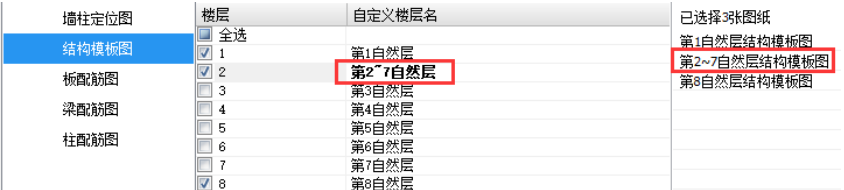 区域B为楼层选择,在某一施工图类型页面下,可将勾选楼层的这类施工图列入到区域C的出图列表中。鼠标点击楼层名可进行自定义修改,如可将“第2自然层”定义为“第2~6自然层”以表达在图纸中标准层出图的归并。修改楼层名后,区域C的图纸名称会联动修改,如图。