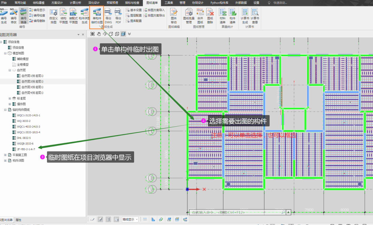基于设计或出图需要,用户可在点击“单构件临时出图”菜单后,点击任一已拆分、配筋的预制构件,以查看该构件的详图,可用于临时查看构件详图或单构件补充出图。通过该功能生成的构件详图可在“项目浏览器”中的“临时构件图纸”进行查看,如图所示,可双击条目查看相应图纸。