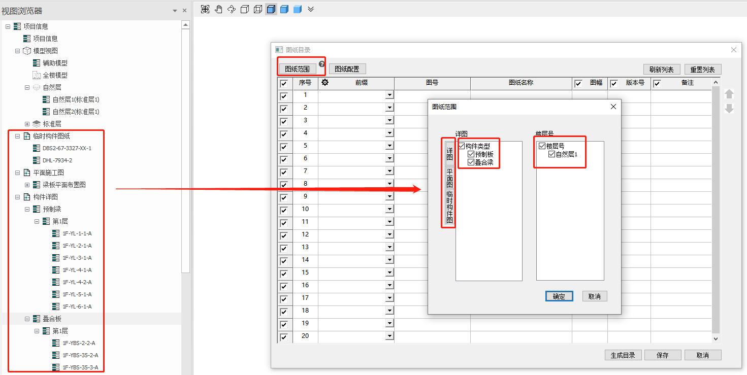 首先通过【图纸范围】设置生成初始列表内容。此时根据项目数生成的图纸分为三类: 详图、平面图、临时构件图,根据复选框确定图示列表,此列表只显示项目树中存在的预制构件图纸和关联的楼层信息。