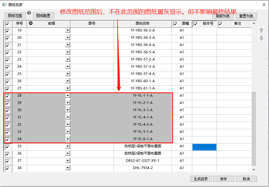 需要注意,若已生成列表后,再次对图纸范围进行变更,则不在此范围的图纸会有灰色底色显示,提示用户此列表范围已调整,如下图所示:
