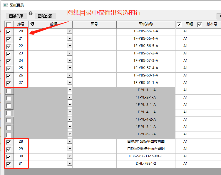 图纸目录生成dwg图的最终结果根据复选框确定,并且序号会根据复选框的勾选情况自动顺延排序,无需手动调整。