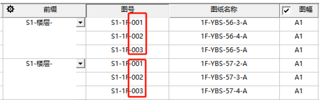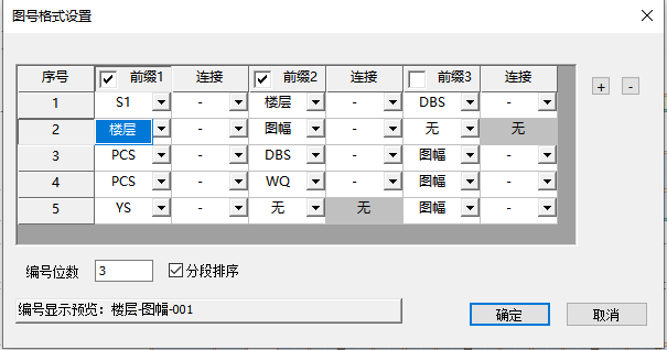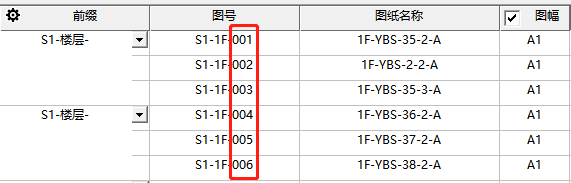 点击【前缀】设置,可设置图纸的编号前缀,并调整前缀的样式。通过复选框可取消和增加前缀名称。下拉条可配置前缀的具体内容,默认提供楼层、图幅选项可自动读取模型中的图纸数据,双击下拉框也可直接修改为固定文字。编号为数为设置编号的格式,例如设置为3位,则第一张为xx-001。