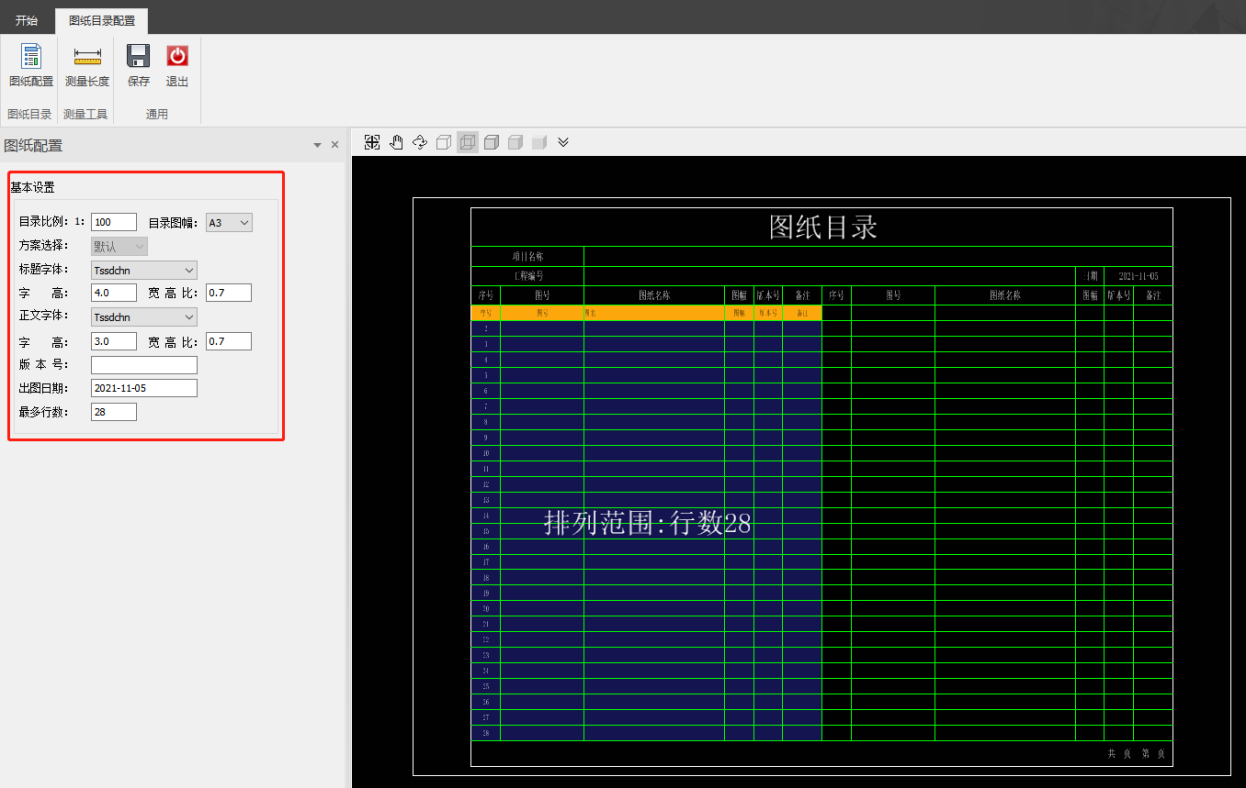 当图纸列表确定后,点击【图纸配置】可进行DWG图的相关设置。比如调整图幅、字体、日期和版本号等。最多行数表示在此图幅下单列排布最多的行数,用户可根据表格需要自行填写。点击保存后退出此环境,保存相关设置。