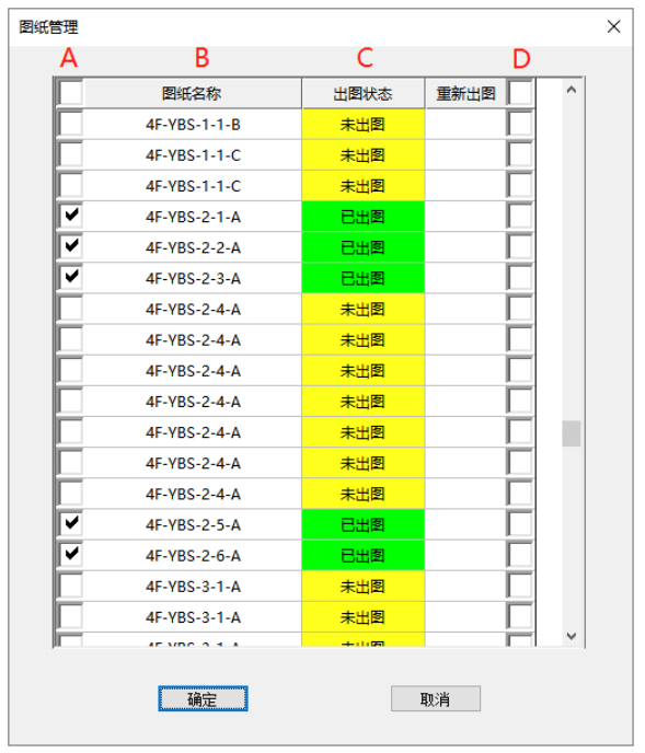 图纸输出后,可进行图纸批量管理,如下图所示。在图纸管理的A列中,已出图构件会显示为勾选状态,如需删除相应图纸,取消其在A列的勾选即可。B列为构件详图对应的构件编号,仅用于查看,不能修改。C列为某构件的出图状态,可与A列的勾选状态参考对应。当某一构件已出图,但进行了模型修改后,用户可通过勾选其相应的D列,重新为该构件出图。