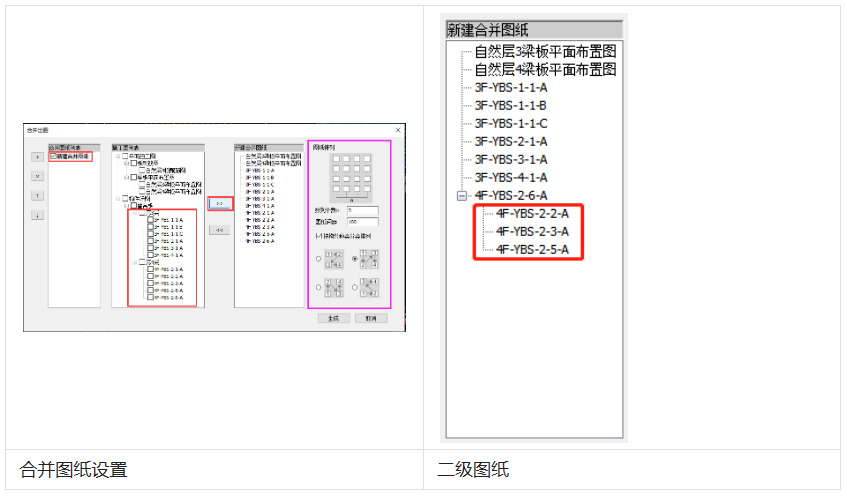 已加入到第三列合并图纸列表中的均为并列的一级图纸,当选中第三列已添加的某一图纸,再次从施工图列表里添加,即可生成二级图纸。也可通过鼠标按住第三列中的某一图纸拖动到另一张图纸上生成二级图纸,详右图。一级图纸和二级图纸的排布方式会有区别。