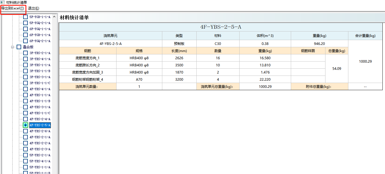 点击“材料清单”,生成“材料统计清单”表格,可查看全部或每一类型的预制构件的数量、材料体积、重量、钢筋用量、相关附件型号及数量等数据信息,如下图所示。生成的数据表格可导出到Excel中进行处理。