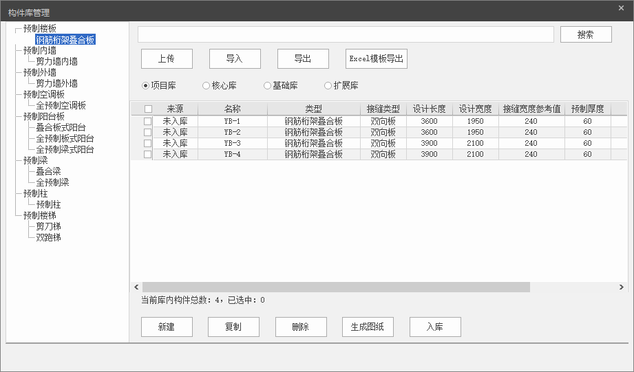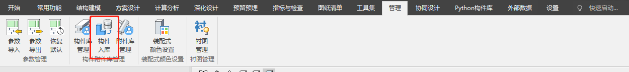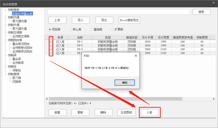 若希望将项目模型中的构件存储入库,可使用【构件入库】功能,在模型中选中需要入库的实际拆分的参数化构件,即可在构件库中查看入库的预制构件信息。