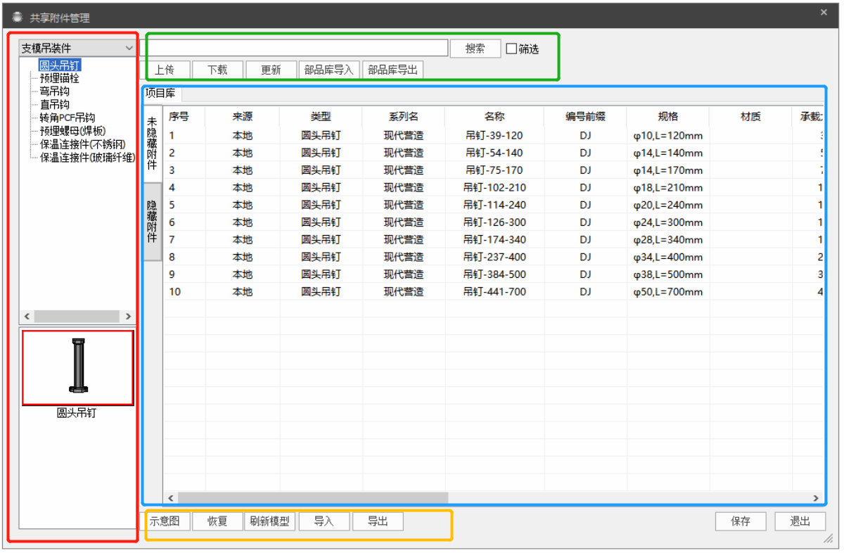 用户可使用【附件库管理】功能对程序内的所有附件信息进行查看和管理,点击【附件库管理】,弹出截面如下图所示。下图红框区域显示附件类型和附件功能分类,绿框和黄框区域为管理功能,蓝框区域为显示附件信息列表。