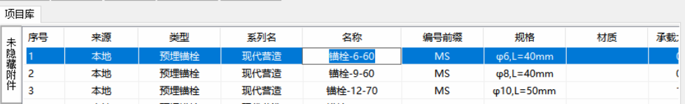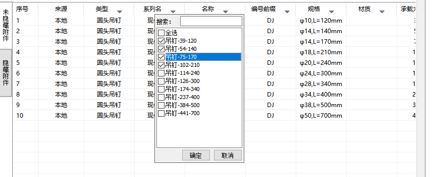 【隐藏行】:在【未隐藏附件】页签界面,可单选/多选附件行,隐藏该规格附件至【隐藏附件】页签;反之,在【隐藏附件】界面中,可对附件【取消隐藏】。隐藏的附件在构件的拆分和配筋、埋件设计中的附件选用下拉列表中不显示。