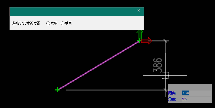 选择指定第一条尺寸界线原点时,可分别指定两个标注原点,然后指定尺寸线位置,软件会根据尺寸线放置位置自动判断是垂直标注还是水平标注。也可根据面板选项,选择垂直或水平标注,如-22。