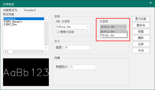 在文字样式中,可修改文字的字体,在字体名下拉表选择需要选用的字体即可。若在字体名里选择的是shx格式字体,则会激活“使用大字体”的选项,若勾选使用大字体,可通过大字体下拉框选择需要的shx大字体,如下图所示。用户也可将自己的shx字体文件放置到安装目录下的font文件夹中,在此对话框中进行选择。在文字样式里可设置文字的高度和宽度因子。当此处文字高度设置为0时,文字的高度按照书写和生成文字的工具里设置高度;当文字高度设置为大于0时,则按此处设置的高度。修改字体后可通过预览窗口查看其效果。