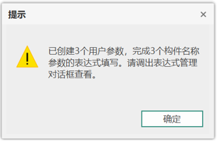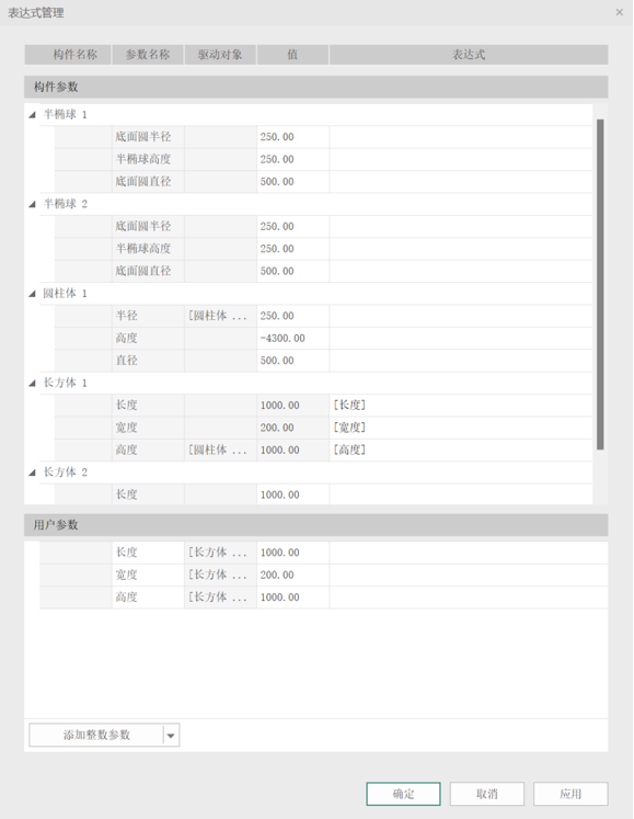 1. 可以在“表达式管理”对话框中查看到程序自动创建的BFA用户参数和表达式。支持用户将BFA用户参数修改为对应的业务名称,如将“高度”修改为“设备鞍座高”。