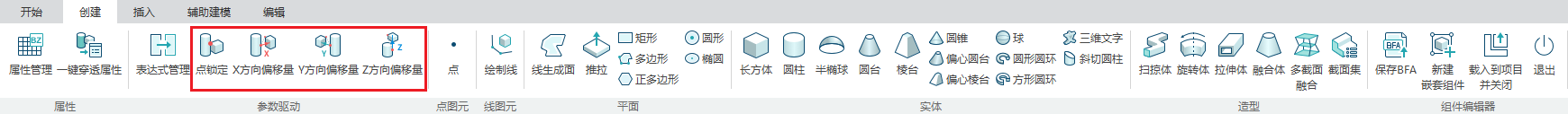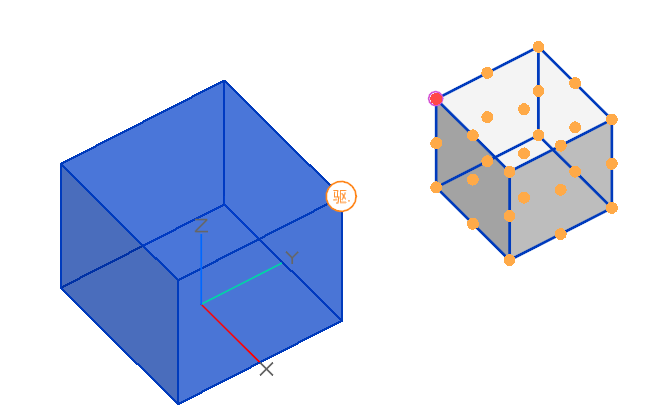 - 驱动点:所有驱动点的统称,包括已创建驱动关系和未创建驱动关系的所有驱动点。程序预定义基本体上的一些特征点为驱动点。在创建空间定位关系时,只能选择构件上的驱动点进行创建。