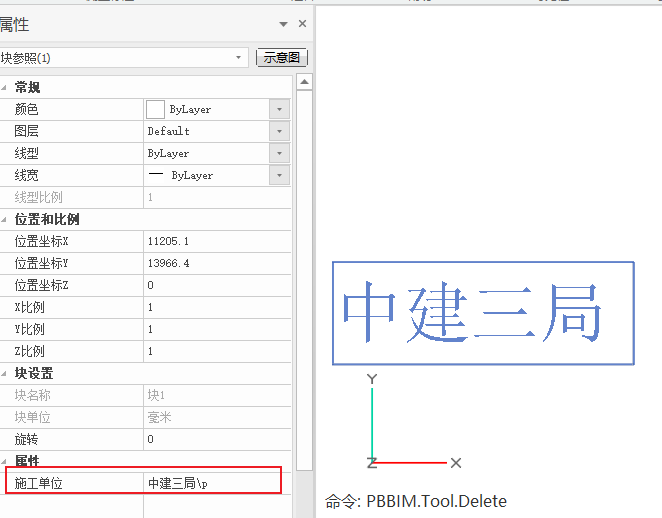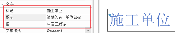 - 值:在布置图块实例的时候如果没有手动输入新的属性文字内容,布置下去的默认值显示。如“中建三局”、