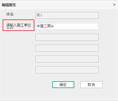 - 提示:在布置图块实例的时候弹出属性文字的输入提示面板时,对该字段需要输入的内容的提示。如“请输入施工单位名称”