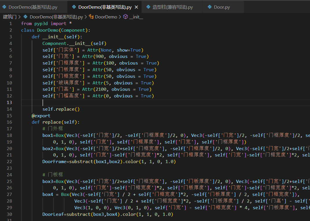 在第二部分的前半部分中,定义class时,不再继承自`Component`,而是继承自引用的库文件中的某个基类。案例中需要创建一个平开门,因此继承自Door库中的平开门。此外,我们发现,在参数定义时,基类写法并没有定义参数;在后半部分的建模过程中,直接使用了一些参数。这里,我们先来看一下door.py里面有什么