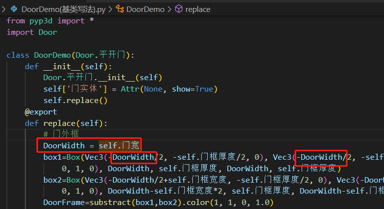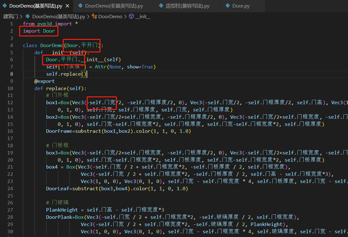 因此,我们在创建属于Door这个库中所定义的类别的门时,就可以使用基类写法,在定义部分就设置好继承自谁;在定义参数时,如果这个参数属于Door中已经定义的部分,务必直接使用(可以在第二部分的后半部分重新起个变量名)